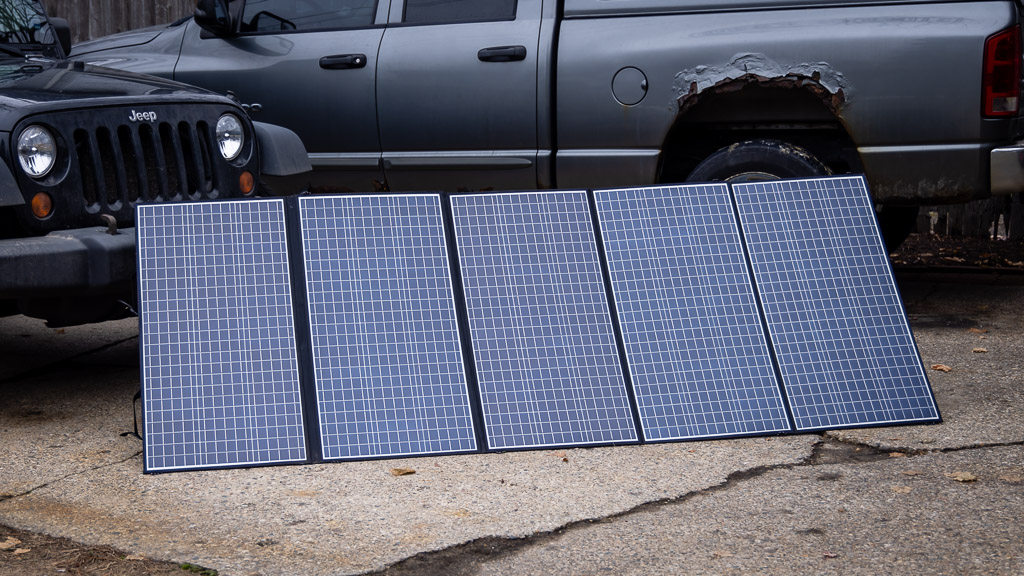 When paired with 1 kWh of energy storage, it can run a 60W portable car fridge and LED lights all day.